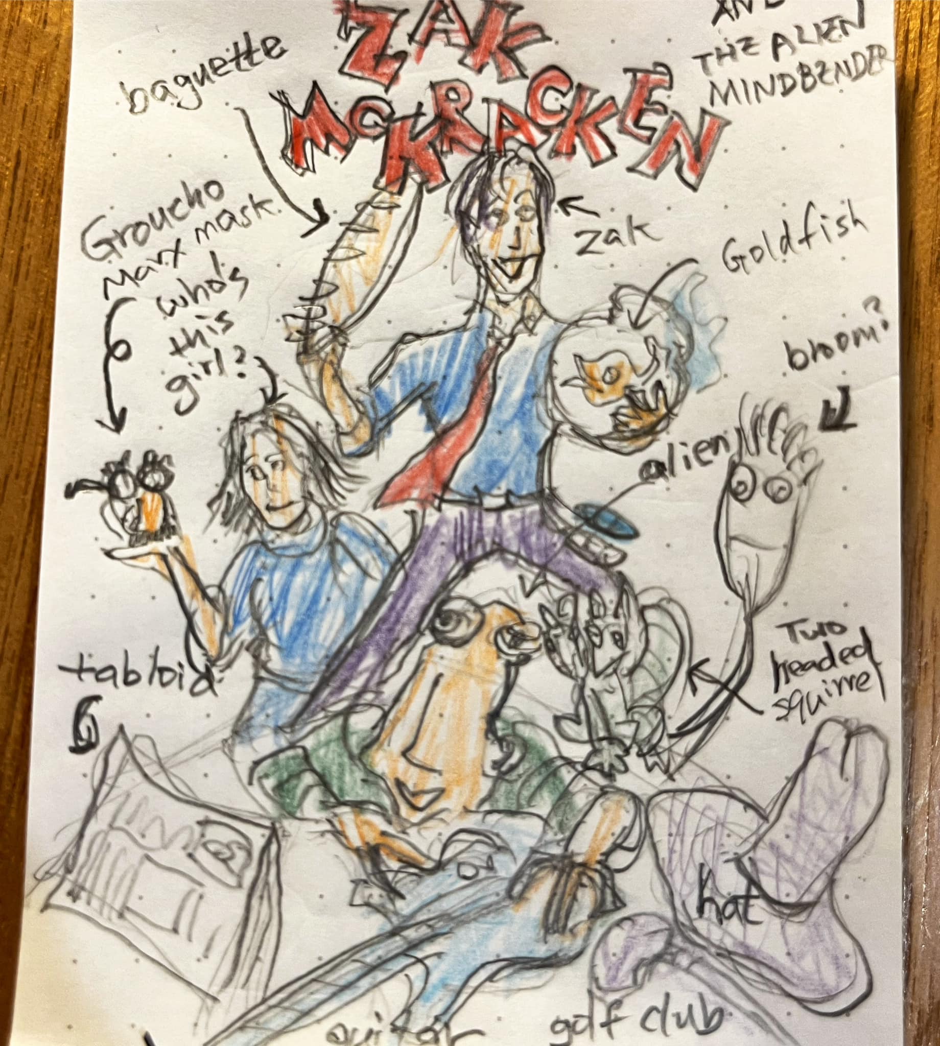A tribute to Zak McKracken and the Alien Mindbenders, an old adventure game. The game has the greatest cover art ever. I haven’t played the game myself, but what could the plot be? Zak McKracken, a tabloid journalist is holding a baguette and a fishbowl, standing on a pile of fallen alien guitarists in cowboy hats. There is a broom with a face, a two-headed squirrel, and a girl holding a Groucho-Marx mask. Somebody should turn it into a children’s book.
